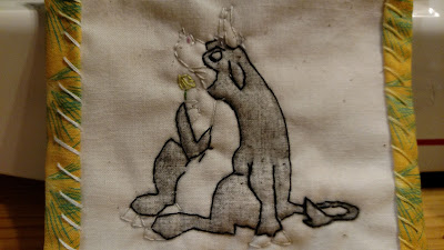 This pic doesn't do him justice. That's Ferdinand just having a sit and sniffing a flower. He's crayon tinted with single strand outline. The backing fabric was a scrap from the other swap I'm about to show off.